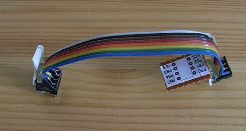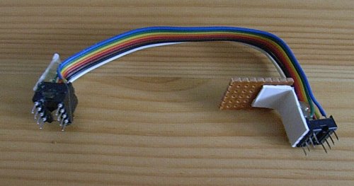 Die achtadrigen Adapterleitung kann mit wenig Aufwand selbst hergestellt werden. Es wurden dafür zwei normale 8-polige IC-Fassungen, eine 8-polige Präzisions-IC-Fassung, ein Stück 8-adrige Flachbandleitung, zwei Winkel aus Kunststoff z. B. aus dem Rest eines Stück Kabelkanals o.ä. und etwas Lochrasterplatinenmaterial benötigt.