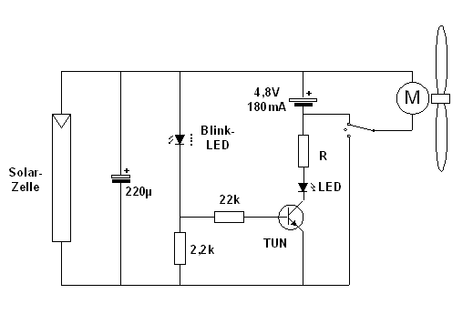 Zur Funktion: Die Blink-LED erzeugt einen 1- bis 2-Sekundentakt, der den Transistor steuert. Die zweite LED zeigt den Ladestrom an. Dadurch kann man auch immer schön erkennen, ab wann die Sonnenintensität ausreicht, um den Akku zu laden. Außerdem verhindert die zweite LED durch ihre Diodenwirkung ein Entladen des Akkus bei nicht ausreichend beleuchteter Solarzelle. Der Widerstand R wird so dimensioniert, dass einerseits die LED gut geschützt ist, andererseits der Ladestrom noch effizient genutzt wird, d. h. Werte zwischen 10 und 200 Ohm sind hier angemessen. TUN ist ein Universal NPN-Transistor (z. B. BC238 o. Ä.).