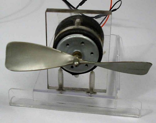 Die folgende Abbildung zeigt einen solchen Solarmotor mit einem aufgesteckten Propeller. Einfache Propeller bekommt man preisgünstig in jedem Modelbaushop. Die Halterung wurde aus Plexiglas- bzw. Polycarbonatglas-Resten aufgebaut.