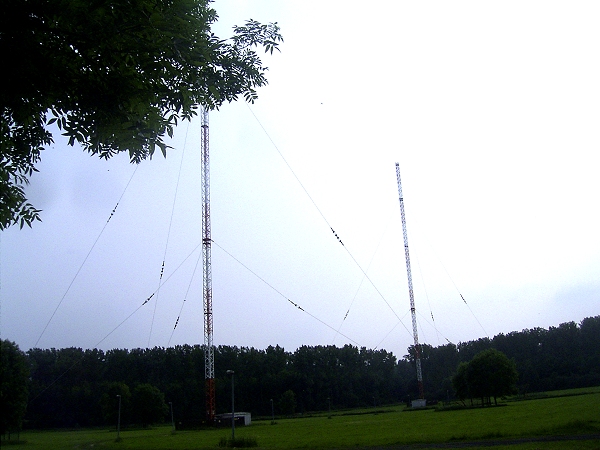 Wie groß ist wohl der Strom und wie hoch die Spannung? Geht man von Marconis theoretischen 30 Ohm aus, wären es bei einer Sendeleistung von 100 kW gerade mal 58 A und 1,7 kV. Aber die Antenne ist kürzer (100 m) als Lambda (546 m) -Viertel, da kommt noch etwas Blindleistung hinzu. Ich schätze, der Strom ist nicht größer als 100 A und die Spannung liegt unter 5 kV, was zur Dicke der Zuleitung und zur Länge der Isolatoren passt. Das klingt relativ harmlos und erklärt auch, warum weder die Digitalkamera noch mein Radio im Schatten des Senders ihren Geist aufgaben. An der Spitze des Mastes ist die Spannung dagegen sehr viel höher. Ein Segelflieger sollte Abstand halten, wenn er nicht heiße Füße riskieren will.