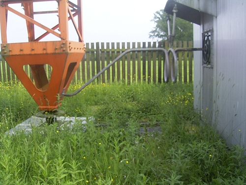Die Sendemasten sind von einem einfachen Lattenzaun umgeben, was ein Foto durch die Lücken im Zaun erlaubt (Wer über den Zaun klettert wird gebraten!). Mit eingezäunt ist ein kleines Blechhäuschen mit der Antennenanpassung. Darin vermute ich riesige Spulen und Kondensatoren. Es gibt auch einen Ventilator, vielleicht weil die Spulen warm werden. Ein dicker „Draht" verbindet die Anpassung mit dem Fußpunkt der Antenne. Die Spule mit zwei Windungen ist vermutlich nicht in erster Linie Teil des Anpassnetzwerks sondern eher eine mechanische Entkopplung, damit das Schwingungen nicht das Häuschen zermürben.