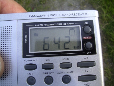 Ich hatte ein kleines Radio dabei und wollte natürlich wissen, ob es so nah am Sender noch funktioniert. Es funktionierte völlig ohne Rauchwölkchen, allerdings stark verzerrt. Und die Grenzen der Selektion waren endgültig überschritten: Trotz Superhet und ZF-Filter war der Deutschlandfunk nicht nur bei 549 kHz sondern über die gesamte Mittelwelle zu hören. Bei 642 kHz gab es eine laute Pfeifstelle. Ich habe diese Frequenz fotografiert um zu Hause mal nachzurechnen, was da wohl passiert. Der Taschenrechner sagt: 549 kHz * 2 = 1098 kHz, 1098 kHz - 642 kHz = 456 kHz, was der ZF des Radios entsprechen sollte. Also: Im Radio bildet sich eine Oberwelle der Grundfrequenz und interferiert direkt mit der Oszillatorfrequenz des Superhets.
