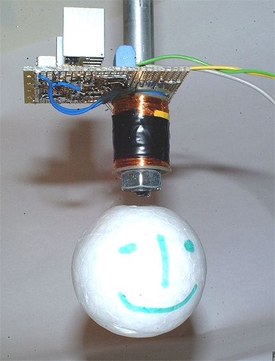 Als Schwebekörper wird ein kleiner Magnet aus einem Lautsprecher verwendet. Überden Magnet wurde ein Stück Schlauch geschoben so wird ein Kippen des Magnets verhindert. Natürlich kann ein attraktiverer Körper verwendet werden, z.B. kann man den Magnet in einen Tischtennisball einkleben. Die Einstellung der Elektronik ist schwierig, hat man aber den richtigen Arbeitspunkt gefunden schwebt der Magnet stundenlang und kleine Störungen werden gut ausgeregelt.
