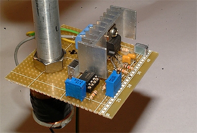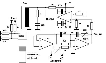 Die Ausgangsspannung des Hall Sensors SS945 wird in einem Operationsverstärker verstärkt und der Regelschaltung zugeführt. Die Ausgangsspannung der Regelstufe häng vom Hall-Signal und dem eingestellten Arbeitspunkt ab. Die Regelverstärkung und Zeitkonstante wird mit einem weiteren Poti eingestellt. Da die Magnetspule höhere Ströme von bis zu 300 mA benötigt wird ein Leitungsverstärker in die Regelschleife geschaltet. Der TDA 2040 ist zwar eigentlich für NF-Verstärker gedacht eignet sich aber auch gut als Gleichspannungsverstärker für Servozwecke. Wichtig ist die Beschaltung des Ausgangs mit der RC-Kombination (1 Ohm, 220 nF) um hochfrequente Schwingungen zu verhindern. Auch die beiden 100 nF Kondensatoren direkt an den Betriebsspannungsanschlüssen des IC's dienen diesem Zweck. Die Magnetspule wurde aus einem alten Ventil (12V) gewonnen. Der Kern ist eine M-10 Eisenschraube auf die am unteren Ende direkt der Hallsensor geklebt ist.