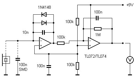 Ein Passiv-Infrarotsensor ist ganz ähnlich aufgebaut wie ein Piezo-Schallwandler. Mit dem richtigen Verstärker kann der Piezo-Kristall daher als Infrarotsensor dienen. In der Nähe eines wärmeren Körpers erwärmt sich der Kristall geringfügig. Dabei wird eine elektrische Ladung verschoben. Der erste OPV ist als Integrator geschaltet, wobei die beiden Dioden für eine Spannungsbegrenzung und für ein Rückstellen in die Ruhelage führen. Die Ausgangsspannung wird noch einmal zehnfach verstärkt. Am Ausgang erscheint eine deutliche Spannungsänderung, wenn man sich dem Sensor nähert.