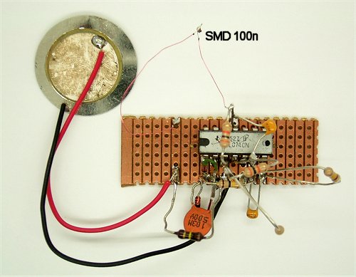 Alternativ kann auch ein keramischer Kondensator als Sensor dienen. Günstig ist ein möglichst kleiner SMD-Kondensator mit 100 nF. Der Sensor-Kondensator ist mit 4,5 V geladen. Da sich bei einer Temperaturänderung die Kapazität ändert, wird eine Ladung verschoben. Das Verstärkerprinzip entspricht dem bei einem Kondensatormikrofon, nur in diesem Fall als Temperatursensor. Wegen seiner geringen Wärmeträgheit funktioniert der Kondensator sogar besser als der Piezo-Sensor. Nun könnte man noch einen Parabospiegel und eine IR-durchlässige Abdeckung gegen Luftströmungen einsetzen.