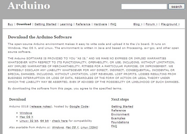 Das Spiel wurde mit der Arduino-Umgebung in der Sprache C++ geschrieben. Im Folgenden beschreibe ich, wie man sich die Umgebung einrichtet um das Spiel selbst zu kompilieren. Ich hoffe damit den Grundstein für eine eigene Pong-Umgebung setzen zu können, denn die Umgebung bietet einige Vorzüge zu denen ich später noch kommen werde. Jetzt an's Einrichten: In meinem Fall ist das Betriebssystem Windows XP. Zunächst lädt man sich von arduino.cc die aktuellste Version der Umgebung herunter: