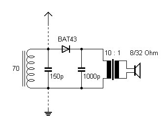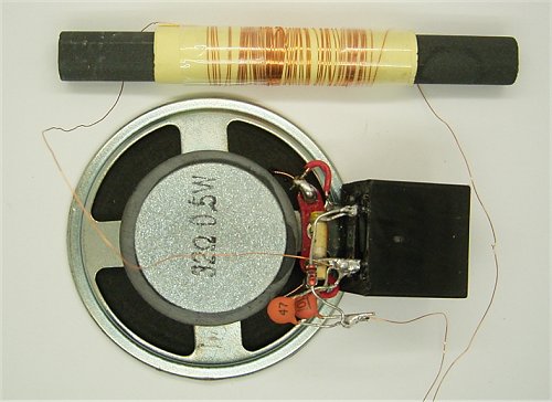 Der Empfänger verwendet einen Ferritstab mit 70 Windungen CuL 0,2 und mit einem Schwingkreiskondensator von 150 pF. Die Feinabstimmung erfolgt durch Verschieben des Ferritstabs. Eine Schottky-Diode BAT43 demoduliert das HF-Signal. Zur besseren Anpassung an den Lautsprecher wird ein NF-Trafo 10 : 1 verwendet. Das Radio wurde ich eine kleine Pappschachtel eingebaut. Der Ferritstab kann immer noch verschoben werden.