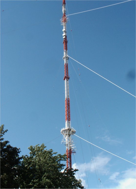 Aber - leider - weit gefehlt: Direkt neben dem Sender war nichts zu hören. Ein Lob für die Erbauer der Sendeantenne! Die Feldstärke ist offenbar neben dem Sender nicht übermäßig hoch, sodass keinem Wanderer warm wird. Die Mittelwellenantenne an dem 300 m hohen Mast ist eine Reusenatenne aus mehreren Drähten, die in einigem Abstand um den Mast abgespannt sind und nur etwa ein Drittel der Höhe beanspruchen. Die Leistung von 100 kW verteilt sich offenbar so auf die einzelnen Drähte, dass an keiner Stelle im Nahfeld eine extreme Feldstärke auftritt. Deshalb reichte meine Ferritantenne nicht aus. Ich bin mir aber sicher, mit einer Drahtantenne von zwei bis drei Metern hätte es geklappt. Allerdings war ich nicht darauf vorbereitet, und außerdem werden solche Konstruktionen direkt neben dem Sender vielleicht nicht gern gesehen.