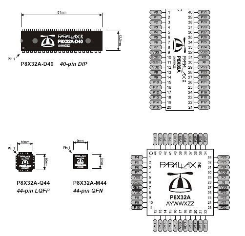 Der Propeller hat 32 I/O Pins welche von allen „COGs" angesteuert werden können. Vier Pins haben eine besondere Aufgabe. P30 und P31 fungieren als serielle Schnittstelle zur Programmierung des Chips und als Interface zum PC. Pin 28 und 29 ermöglichen eine I2C (SCL und SDA) Verbindung mit einem externen EEPROM. Dieser kann das Programm auch nach einer Spannungsabschaltung festhalten. Das interne Reset-Programm ist so ausgelegt, dass bei einem Resetimpuls oder bei der Einschaltung der Stromversorgung dieser Programmcode geladen und gestartet wird.