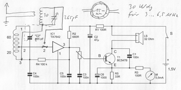Den Erfolg brachte eine freitragende Spule mit 30 Windungen. Der Draht wurde auf eine Mignonzelle gewickelt, abgestreift und dann umbunden. Die Spule hat keine Anzapfung. Trotzdem reicht die entdämpfende Wirkung des Eingangs nicht bis zum Schwingungseinsatz.