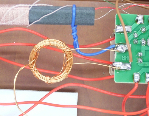 Zusätzlich gibt es zwei Windungen für die Antennen-Koppelspule. Die beiden Drähte ragen aus dem Gehäuse und werden mit Erde und Antenne verbunden.