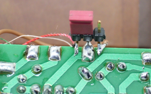 Der Kurzwellenkreis verwendet die zweite Drehkohälfte. Damit ist die Bandumschaltung ganz einfach. Nur der Eingang des Empfängers muss wahlweise an die Anzapfung der Mittelwellenspule oder an das heiße Ende Kurzwellenkreises gelegt werden. Für diesen Zweck habe ich einen dreipoligen Pfostenstecker eingebaut. Ein Jumper dient dann als Bandumschalter.