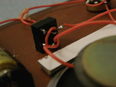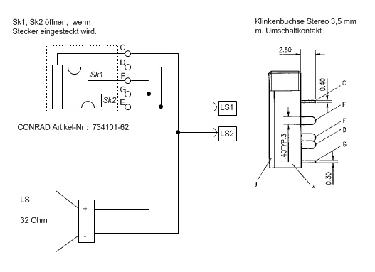 Aber der Einbau der Buchse: nicht unkompliziert. Insbesondere ist es nicht leicht, mit eienm Holzbohrer ein glattes Loch in Pappe zu machen. Es entstehen Wülste, die mit einem scharfen Messer (Rasierklinge) zu entfernen sind. An der Schaltbuchse sind die Stereokontakte zu überbrücken. Es sind zwei, und die kreuzen sich, wenn man das vorgeschlagene Bauteil wählt.