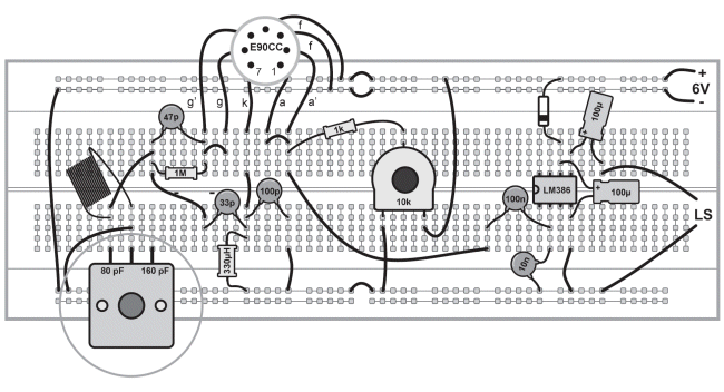 Die Schaltung hat einen kapazitiven Spannungsteiler zur Zuführung des verstärkten Kathodensignals. Mit den Kondensatoren von 33 pF und 100 pF wird der Schwingkreis bei etwa 25% angezapft, was zu einer stärkeren Rückkopplung führt als bei den bisherigen Audionschaltungen. Der Kathodenstrom wird über die Festinduktivität von 330 µH als Kathodendrossel abgeleitet.