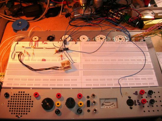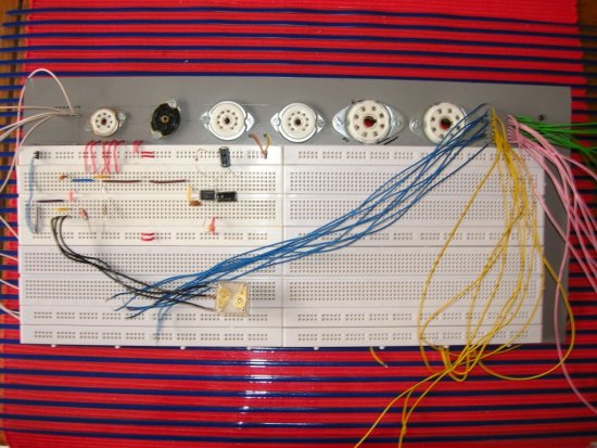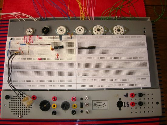 Das bisherige System habe ich um 3 weitere Breadboards und diverse Röhrensockel erweitert. Es handelt sich dabei um 2 x 7-polige Miniatur, 2 x 8-polige Loktal und 2 x 9-polige Noval. Die Röhrensockel habe ich mit Kabeln versehen, die lang genug sind jeden Platz auf den Breadboards zu erreichen.