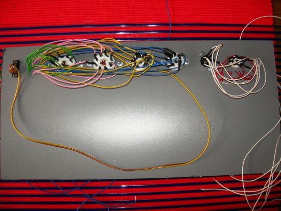 Und so sieht die Verdrahtung (bisher) von unten aus. Nun kann die Platte wieder zurück in die Busch-Konsole. (erst einmal)