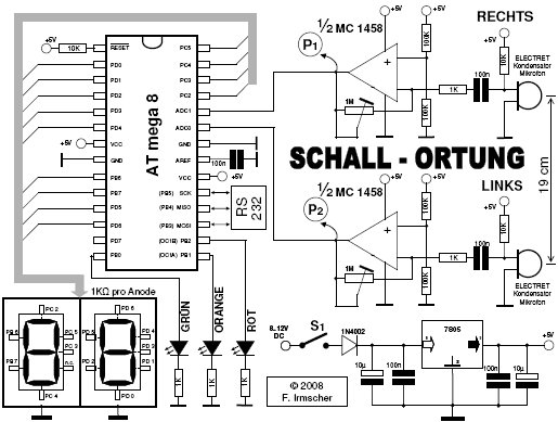 Natürlich wären auch hochwertigere Vorverstärker einsetzbar. Die Schallortung funktioniert aber auch schon so. Zur Spannungsstabilisierung auf 5V wird ein Festspannungsregler verwendet.