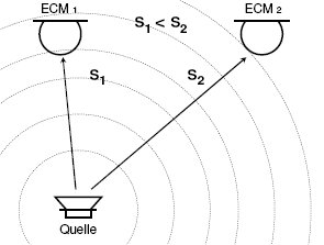 Je „seitlicher" der Schall auf die beiden Mikrofone trifft, desto größer ist die Laufzeitdifferenz.