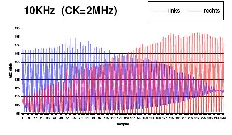 In schneller Folge werden mit einer Rate von insgesamt ca. 40 kHz stets abwechselnd je ein Sample zuerst für den linken Kanal (ADC 0) und dann für den rechten Kanal (ADC 1) als 8-bit-ADC-Wert im RAM gespeichert. Pro Seite sind dies 250 Samples. Die dabei für den einzelnen Kanal zur Verfügung stehende Samplerate von ca. 20 kHz gestattet nach dem sog. Abtasttheorem (Shannon) eine obere Grenzfrequenz von ca. 10 kHz.