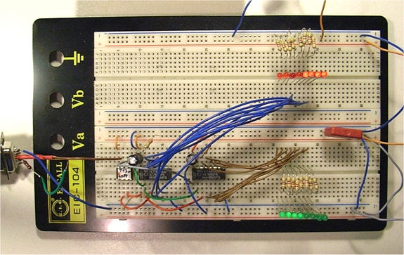 Wäre es Ihnen nicht lieber, Sie hätten für manche Ihrer Projekte mit dem Attiny13 mehr als die vorhandenen Ausgänge zur Verfügung? Man könnte zur Lösung des Problems sicher einen anderen AVR-Controller mit einer größeren Anzahl Anschlüssen nehmen, aber dieser lässt sich nicht so komfortabel wie mit der Software und der Platine programmieren, die zum Lernpaket Mikrocontroller gehört.Da der Attiny13 außer der Leitung für die Kommunikation über eine serielle PC-Schnittstelle nur noch vier Pins frei hat, die man für seine Projekte nutzen kann, führte ich einige Experimente mit Schieberegistern durch, die von ihm angesteuert wurden.Im Bild sind gerade zwei Ics 4094 am Mikrocontroller angeschlossen. An das eine ist der Zahlenwert 15 und an das andere 240 übertragen worden. Dies wird durch die roten und die grünen LOW-Current-LEDs, die über Vorwiderstände an die Ausgänge der Schieberegister angeschlossen sind, dargestellt.