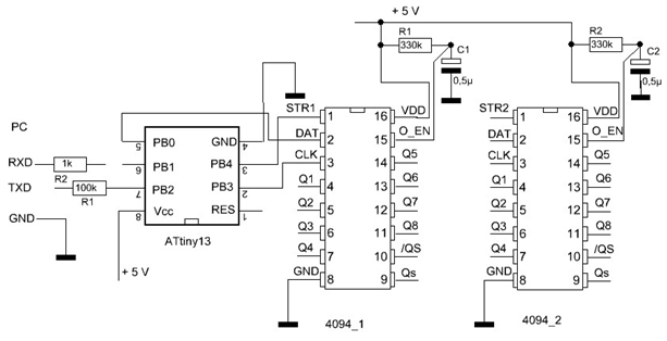 Zunächst schloss ich nur einen Baustein 4094 nach dem Schaltplan oben an den Attiny13 an und wählte dafür folgende Zuordnung: PB0 - DAT, PB4 - STR und PB3 - CLK.