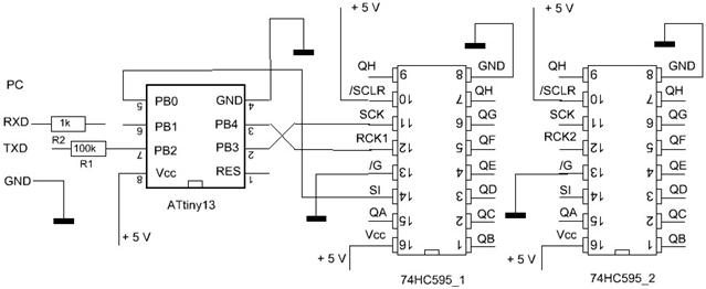 RCK. Es lassen sich auch zwei Bausteine 74HC595 am Attiny13 anschließen.
