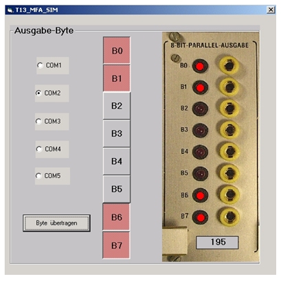 Im Bild ist der Screenshot eines Programms in Visual Basic dargestellt, mit dem es möglich ist, mit der abgebildeten Schaltung und dem compilierten BASCOM-AVR-Programm im Attiny13 für die Ansteuerung zweier Ics 74HC595 eine Platine aus einem sogenannten MFA-Computer zu aktivieren.