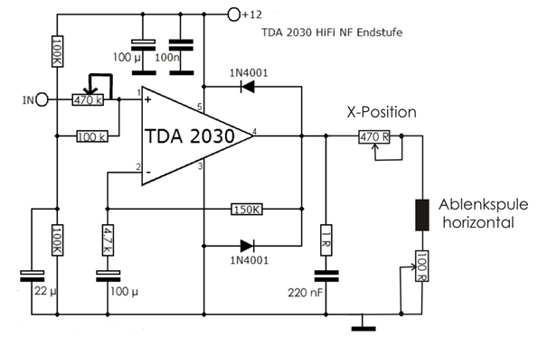 Als Eingangsspannungsteiler (Abschwächer) dienen kleine SMD-Potis die ebenfalls aus der Kamera ausgebaut werden. Der Y-Verstärker besteht aus der Standartschaltung mit dem Audio-IC TDA2030. Für den Horizontalverstärker wird ebenfalls der TDA2030 verwenden, allerdings ist die Standartschaltung etwas abgeändert.