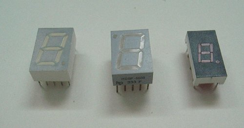 Vor kurzem suchte ich für ein bestimmtes kleines Projekt eine geeignete Sieben-Segment-Anzeige und wollte bei dieser Gelegenheit die gerade vorhandenen Exemplare auf Funktion überprüfen und dabei auch feststellen, ob sie jeweils eine gemeinsame Anode oder eine gemeinsame Katode besitzen. Dies sind drei solche Anzeigen, die ich gerade zur Verfügung hatte.
