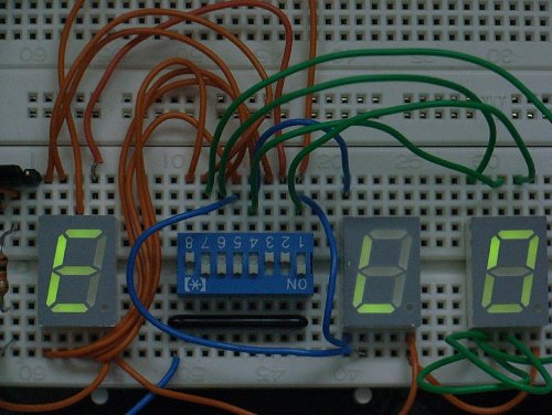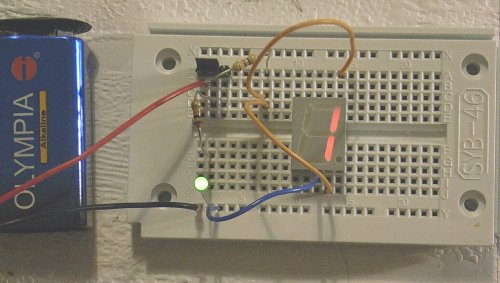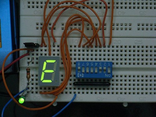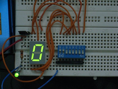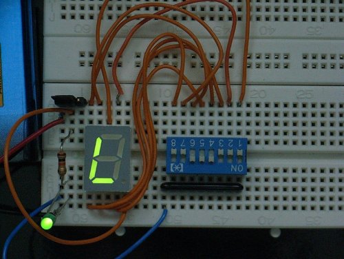 So sah die praktische Ausführung auf einem Steckboard aus. Im Bild leuchten die Segmente a,d,e,f und g. Die zugehörigen kleinen Schalter stehen auf ON, wie es im Bild zu erkennen ist. Es wird der Buchstabe E dargestellt.