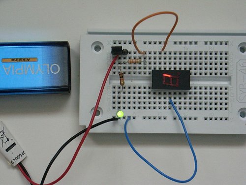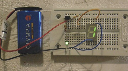 Widerstand von 4k7 zum Pluspol der 9V-Batterie. Mit dieser einfachen