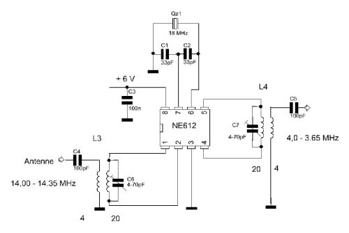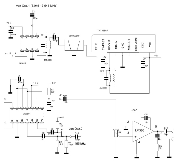 Der Schaltplan enthält den Mischer NE612, dem an Pin 6 das
