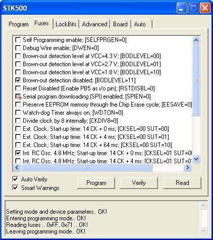 Weitere Versuche mit den Fuses brachten einen Verbrauch unter 2 µA. Wichtig ist nicht nur dass Brown-out Detection ausgeschaltet ist, sondern auch dass die Start-up Time auf Null gesetzt wird, damit der Controller möglichst kurz arbeitet. Zum Test wurde der Tiny13 mit einem Elko mit 1000 µF betrieben. Dieser wurde in 1000 s um 1,3 V entladen. Daraus ergibt sich ein mittlerer Strom von 1,3 µA.