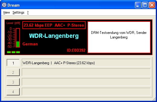 Der erste Versuch wurde mit einem ES-M32-Board von Modul-Bus durchgeführt, weil ich zufällig gerade eins mit einem 12-MHz-Quarz hatte (sonst werden 11,059 MHz verwendet) und weil die Programmierversuche über die eingebaute USB-Schnittstelle bequem übertragen werden können. Nachdem alle Nops richtig eingefügt waren konnte ich ein starkes Signal auf Mittelwelle 1600 kHz feststellen. Und damit war ein erster Empfangsversuch nicht mehr schwierig. Als Basis diente zuerst das Retroradio. Es wurde auf das starke Rauschen des DRM-Senders auf 1593 kHz eingestellt. Dann wurde das künstlich erzeugte Oszillatorsignal über einen Draht in 10 cm Abstand lose eingekoppelt. Das NF-Signal vom Poti kam den Sound-Eingang, wie schon in ELO beschrieben. Mit Dream konnte dann das DRM-Signal dekodiert werden.