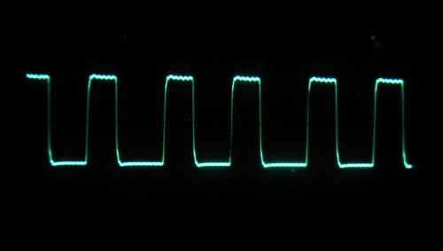 Hier wird ein Port in einer Endlosschleife immer wieder ein- und ausgeschaltet. Eine Portausgabe dauert zwei Quarztakte. Dazu kommt ein Rücksprung zum Anfang der Schleife mit drei Takten. Jeder nop-Befehl führt zu einer zusätzlichen Verzögerung um einen Takt. Insgesamt braucht die Schleife also 15 Takte und erzeugt in dieser Zeit zwei Impulse am Port, wovon einer um einen Takt länger auf dem Low-Pegel verharrt. Effektiv wurde also die Taktfrequenz von 12 MHz durch 7,5 geteilt, sodass sich ein Ausgangssignal von 1,6 MHz ergibt. Durch die ungleichen Pausenzeiten sind zwar noch andere spektrale Anteile vorhanden, sie stören jedoch nicht.