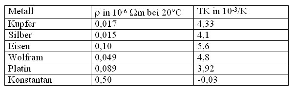 Spezifischer Widerstand und Temperaturkoeffizient einiger Metalle