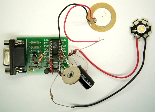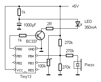 Die Spannung am Mikrofon wird laufend von einem Mikrocontroller Tiny13 über PB4 gemessen. Im Ruhezustand liegt hier eine Spannung von 2,5 V. Wenn ein Impuls erkannt wird soll eine kurze Wartezeit ablaufen und danach ein kurzer Impuls an PB0 ausgegeben werden. Die Wartezeit kann über ein Poti an PB3 eingestellt werden. Der Blitz wird bei den ersten Versuchen noch von einer Power-LED erzeugt. Der Blitzelko von 1000 µF wird auf 5 V geladen. Der Transistor BC337 ist für einen hohen Impulsstrom bis 800 mA zugelassen und treibt die LED ohne Probleme. Später soll PB0 dann über einen Thyristor das Blitzgerät auslösen. Es könnte aber sinnvoll sein alternativ auch den schwächeren LED-Blitz zu verwenden um den Versuchsaufbau zu justieren.