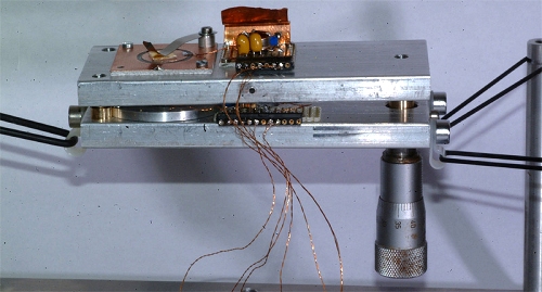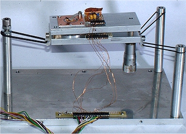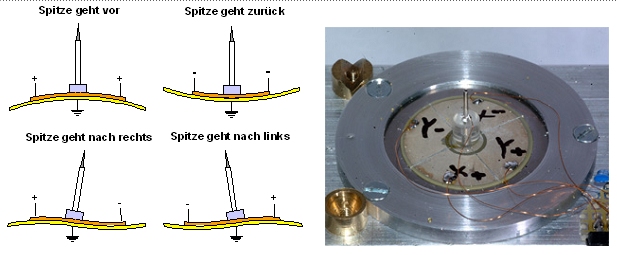 Der wichtigste Bestandteil des STM ist die Vorrichtung zur Bewegung der Spitze. Sie muss in drei Richtungen verstellbar sein. In der Z-Achse für die Bewegung senkrecht zur Fläche, und in der X- und Y-Achse zum Abscannen der Fläche. Da nur kleine Wege im Mikrometerbereich notwendig sind wird fast immer ein piezoelektrischer Verstellmechanismus verwendet. Nach einer Idee von John Alexander kann der X,Y,Z-Scanner mit einem einfachen Piezobeeper aufgebaut werden. John Alexander hat sich das patentieren lassen aber für ein nicht kommerzielles Bastelprojekt kann man es wohl nachbauen. Ein Piezobeeper besteht auf einer dünnen Metallplatte auf die eine piezokeramische Schicht aufgebracht ist. Wird an die Piezoschicht eine Spannung gelegt, verkürzt oder verlängert sie sich je nach Polung und dadurch wird die Metallplatte gebogen. Wird eine Wechselspannung angelegt biegt sich die Platte im Takt und wirkt wie eine Lautsprechermembran.