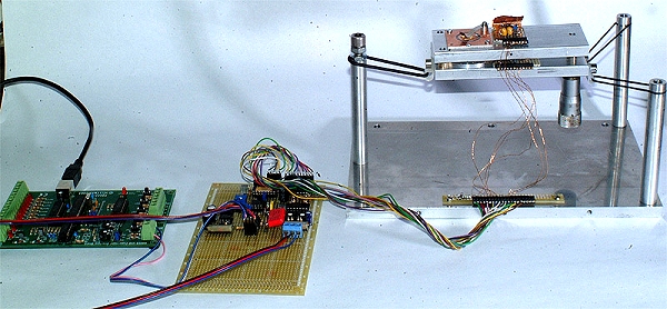 Zur Ansteuerung der Elektronik wird ein Computer verwendet. Der Verfasser benützte das USB-Experimentierboard von Velleman. Der AD-Eingang misst das Z-Piezosignal und die beiden DA-Ausgänge treiben den X- und Y-Piezo des Scanners. Bei Bedarf kann ein einfaches Delphi Programm zur Ansteuerung vom Verfasser erhalten werden.