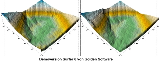 Die Daten können auch in einer 3-D Darstellung angezeigt werden. Dazu eignet sich z.B. die Software Surfer 8 von Golden Software die als Demoversion kostenlos zur Verfügung gestellt wird.