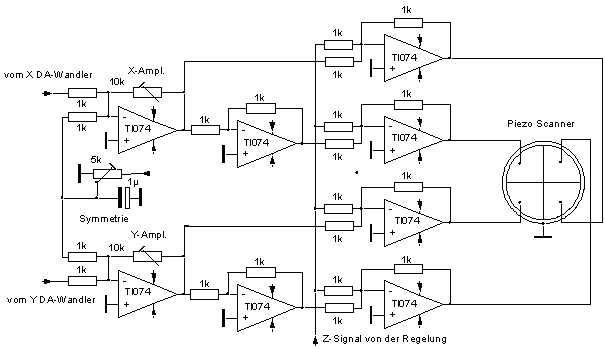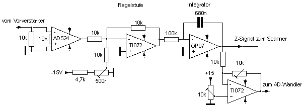 Die auf den Vorverstärker folgende Regelung ist der wichtigste Bestandteil der Schaltung. Sie sorgt für einen konstanten Strom durch die Spitze und damit für einen konstanten Abstand zwischen Spitze und Probe. Durch den extrem nichtlinearen Zusammenhang von Strom und Abstand ist die Dimensionierung nicht einfach, sodass man auf Versuche angewiesen ist. Die Ausgangspannung des Vorverstärkers wird mit einem AD 524 10fach verstärkt und der Regelstufe zugeführt. Die Differenz zwischen Ist- und Sollwert, das Regelsignal wird in einem Integrator aufaddiert. Eine Sollspannung von 470 mV entspricht einem Tunnelstrom von einem Nanoampere und ist ein passender Wert für erste Versuche. Die Ausgangsspannung des Integrators steuert die Auslenkung des Scanners in der Z-Richtung. Wichtig ist, dass die Regelpolarität stimmt. Steigt der Tunnelstrom muss der Abstand der Spitze zur Probenfläche größer werden und umgekehrt. Der Piezo des Verfassers wölbt sich bei positiver Spannung nach vorn, bei steigendem Strom muss somit die Z-Spannung vor den invertierenden Endstufen positiver werden damit die Regelung arbeiten kann. Da das von der Polarisierung der Piezoscheibe abhängt kann das bei verschiedenen Typen unterschiedlich sein und muss durch Versuche bestimmt werden. Das Ausgangssignal des Integrators, das im Regelfall ein Maß für die Oberfläche ist, wird dem AD-Wandler des Messcomputers zugeführt. Da dieses Signal sowohl positive wie auch negative Polarität annehmen kann, der AD-Wandler aber nur positive Spannungen verarbeiten kann wird das Signal mit einem Operationsverstärker in den positiven Bereich geschoben.