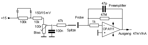 Die durch die Spitze fließenden Ströme sind sehr klein, im Nanoampere Bereich, deshalb wird der Strom/Spannungswandler möglichst nahe an der Abnahmestelle angebracht und gegen Einstrahlungen abgeschirmt. Der Verstärker ist vom Typ OPA 111, mit einem Gegenkopplungswiderstand von 47 MOhm ergibt sich eine Verstärkung von 47mV/nA. Auch die Biasspannung an der Spitze ist klein und sollte bei einigen Millivolt liegen. Die Polarität der Spannung spielt keine so große Rolle, der Verfasser verwendete eine positive Spitze, bei negativer Spitze muss die Regelelektronik entsprechend umgepolt werden.