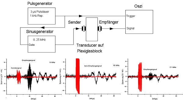 Der Sendepiezo wird mit Sinuspaketen aus einem steuerbaren Generator getrieben. Die Signale am Empfangspiezo können mit einem Oszillografen verfolgt werden.