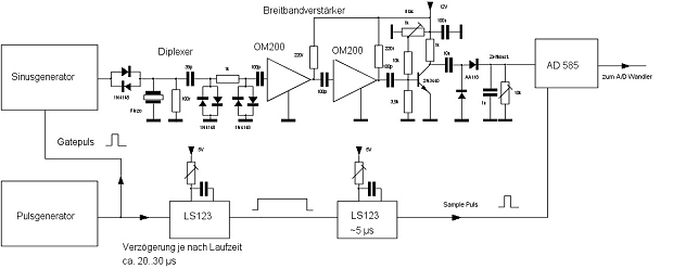 Für das eigentliche Ultraschallmikroskop soll aber der reflektierte Schall gemessen werden, Sendepuls und Empfangssignal liegen am selben Transducer. Da das Empfangssignal mindestens tausendmal kleiner ist als das Sendesignal müssen Vorkehrungen getroffen werden dass die Empfängerschaltung durch das hohe Sendesignal nicht gestört wird. Ein so genannter Diplexer ist die passende Schaltung, die durch Dioden verhindert dass zu große Signale am Empfängereingang anliegen. Das kleine Empfangsignal liegt unter der Schwellspannung der Dioden und kann ungehindert passieren. Nach einer Verstärkerkette wird das Empfangssignal gleichgerichtet und gespeichert. Als Verstärker wurden die etwas veralteten Breitbandmodule OM 200 von Philips verwendet die aber für diesen Zweck nicht ideal sind. Besser wäre ein abgestimmter Verstärker, z.B. ein umgebauter ZF-Verstärker. Der Analogspeicher wird nur für die kurze Zeit aktiviert in der das Empfangssignal zu erwarten ist, so werden Störungen ausgefiltert. Als Speicher dient ein "Sample and Hold" Baustein AD 585 von Analog Device. Getriggert wird der S/H Baustein vom verzögerten Sendegateimpuls. Verzögert wird der Puls mit einem Monoflopbaustein 74 LS 123. Der erste Monoflop hat eine Verzögerungszeit die der Laufzeit des Schallimpulses entspricht, der zweite bestimmt die Samplezeit.