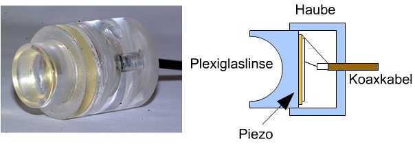 Um mit dem Piezotransducer ein scharfes Bild zu bekommen muss der Ultraschallstrahl gebündelt werden. Das geschieht mit einer Linse aus Plexiglas. Da die Schallgeschwindigkeit in Plexiglas höher ist als im umgebenden Wasser sind die Verhältnisse genau umgekehrt wie in der Lichtoptik. Deshalb fokussiert eine konkave Linse den Strahl, eine konvexe, in der Lichtoptik eine Sammellinse, würde den Strahl aufweiten. Die Linse wird mit einem Kugelfräser aus Plexiglas gefertigt. Auf die Rückseite wird der Piezo geklebt. Da der ganze Kopf im Wasser versenkt werden muss, wird der Piezo mit einer dichten Haube abgedeckt.