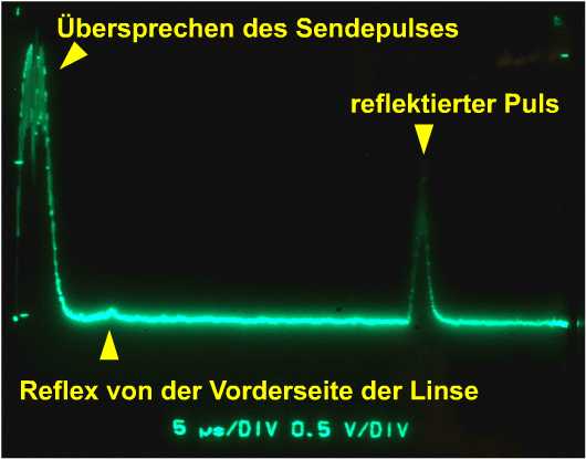 Die Brennweite der Linse hängt vom Verhältnis der Schallgeschwindigkeiten im umgebenden Mediums und im Linsenmaterial sowie vom Krümmungsradius ab. Bei Wasser und Plexiglas beträgt die Brennweite etwa das Doppelte des Krümmungsradius. Hat man mit einem Kugelfräser von 15 mm Durchmesser gearbeitet befindet sich der Brennpunkt etwa 7,5 mm vor der Linse, an dieser Stelle muss sich der abzubildende Gegenstand befinden. Für Hin- und Rücklauf über diese Strecke (insgesamt 30 mm) benötigt der Puls im Wasser 20 µs, plus einige Mikrosekunden für den Weg durch die Linse. Auf diese Zeit muss der verzögernde Monoflop eingestellt werden. Am Besten kontrolliert man die Verhältnisse mit dem Oszi und justiert die Verzögerungszeit auf den benötigten Wert.