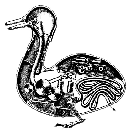 Vaucansons Meisterwerk - die mechanische Ente. Jahrelang verschollen tauchte der Automat 1785 im Besitz des berühmten Arztes und Chemikers Gottfried Christoph Beireis wieder auf, der ihn 1805 Johann Wolfgang v. Goethe sichtlich beschädigt vorführte.