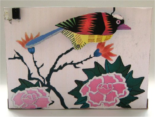 Das hier vorgestellte Modell ist elektronischer Natur und mehr Baumvogel als Ente. Der Vogel kann typisches Vogelgezwitscher von sich geben und alle möglichen Positionen (auch kopfüber) im Baum einnehmen. Angeregt wird der Vogel zum Singen und zur Positionsänderung durch einen sich nähernden Gegenstand. Auf Wasser trinken, Körner aufpicken und Verdauungssimulation wurde verzichtet. Die folgenden Bilder zeigen den einfachen mechanischen Aufbau. Eine Vorlage findet man in der PDF-Version des Artikels, die in entsprechender Größe auf dem Farbdrucker ausgedruckt wird. Vogel und Gehäuse werden auf stabile Pappe aufgeklebt und ausgeschnitten. Das Gehäuse wird gefaltet und verklebt. Lautsprecher, Schrittmotor und Reflexionslichtschranke befestigt man am besten mit Sekundenkleber, ebenso die Vogelfigur auf der Schrittmotorachse.