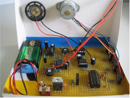 Auf der Rückseite ist die Elektronikplatine, der Schrittmotor und der Lautsprecher untergebracht. Die Stromversorgung übernimmt eine 9 V-Blockbatterie. Es kann aber auch ein Steckernetzteil verwendet werden.
